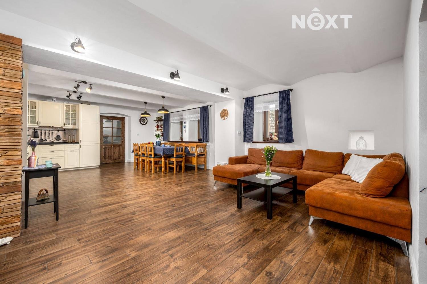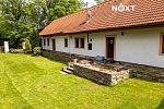 Je plně připraven k trvalému užívání – obývá se, je funkční, útulný a kompletně zařízený pro každodenní život i rekreaci. Dispozice je praktická a prostorná: tři pokoje – dvě ložnice a pracovna, světlý obývací pokoj, velká kuchyně s jídelnou, koupelna, vstupní hala, technická místnost, chodba. Obytná plocha této části činí velkorysých 130 m². Celková užitná plocha včetně sklepa a stodol je cca 200 m². Součástí fotodokumentace je i dispoziční plánek.