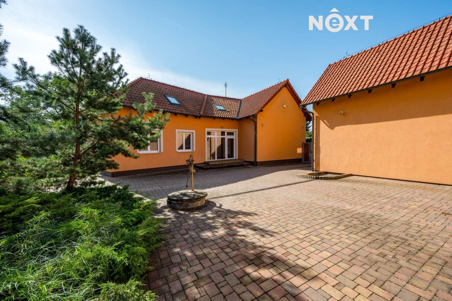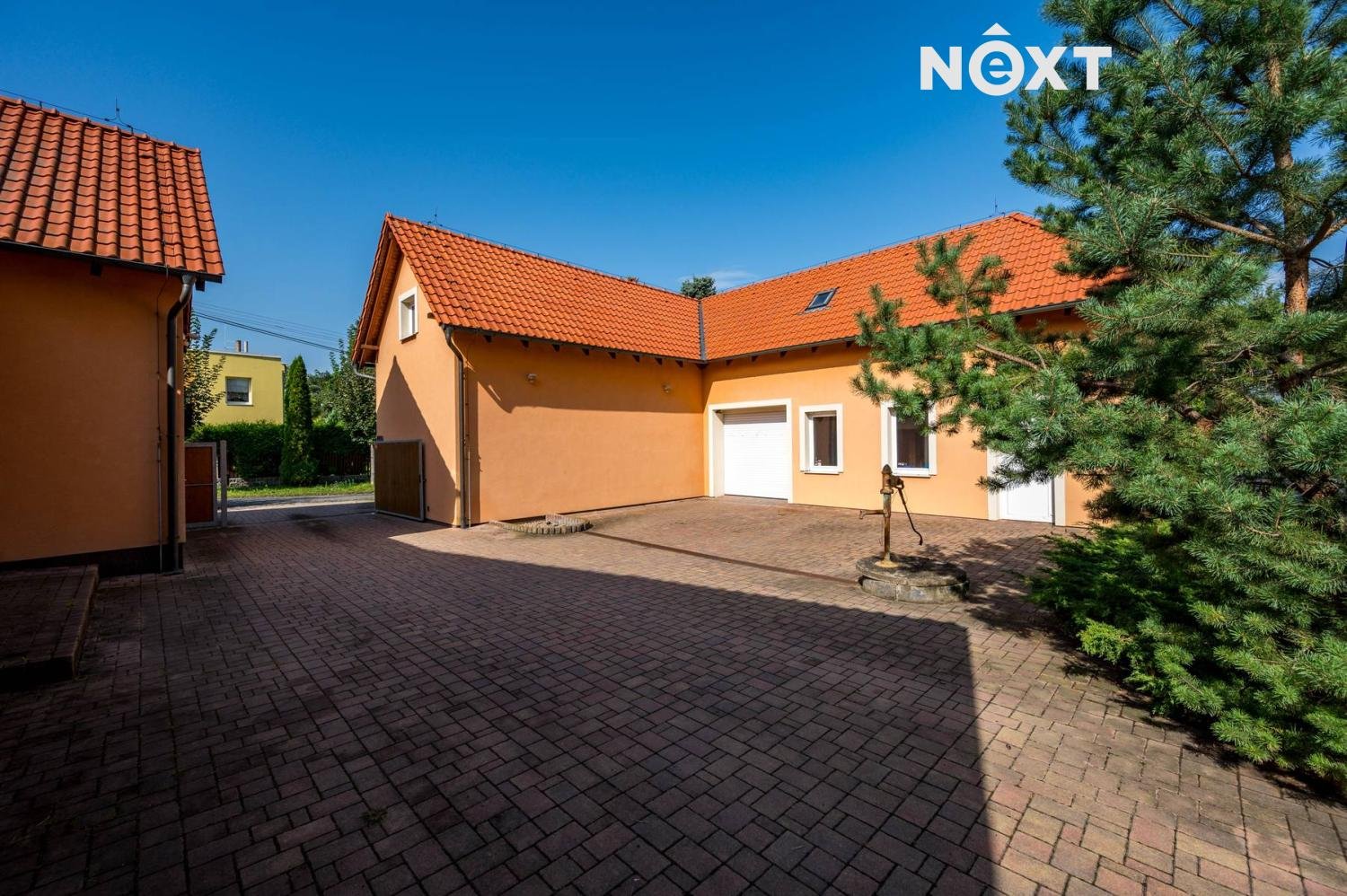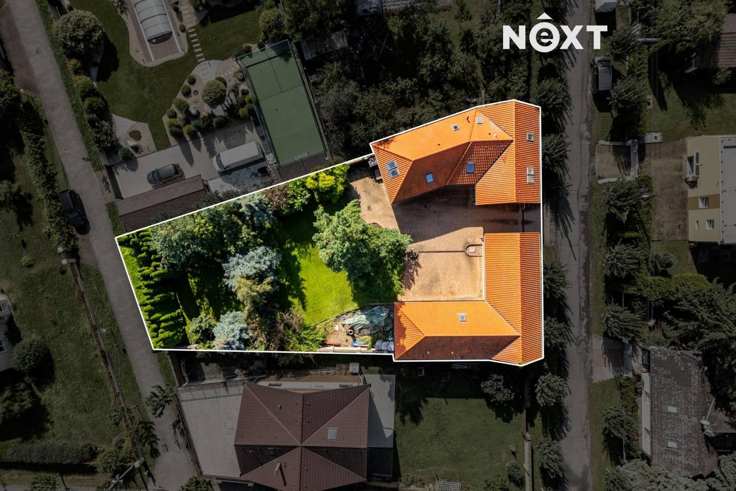 Na pozemek se dostanete přes elektrická vrata, za kterými se rozprostírá nádvoří s parkovací kapacitou pro až šest aut. V zadní části pozemku se nachází pečlivě udržovaná zahrada, která nabízí dokonalé místo pro odpočinek v soukromí. Zahrada je vybavena automatickým zavlažováním a umožňuje tak snadnou údržbu.