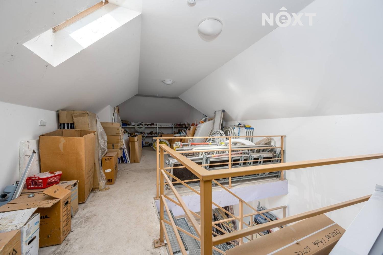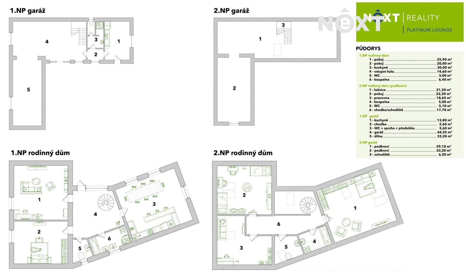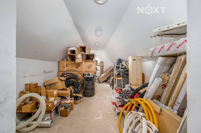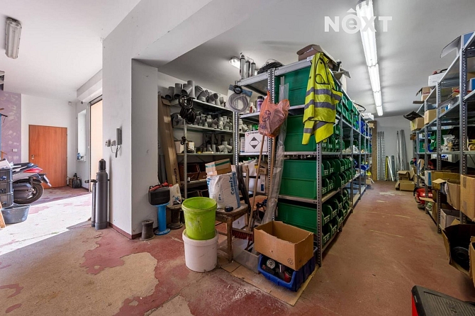 Součástí domu je velká garáž o ploše zhruba 180 m² se dvěma patry. Garáž nabízí nejen parkovací prostor (vjezdová vrata o šířce 2,7 m), ale i kuchyň a toaletu se sprchovým koutem, což ji činí ideální pro dílenské nebo jiné technické využití.
