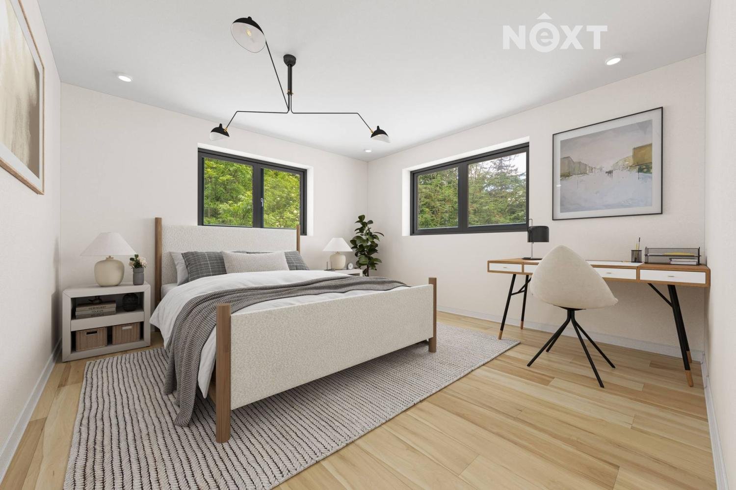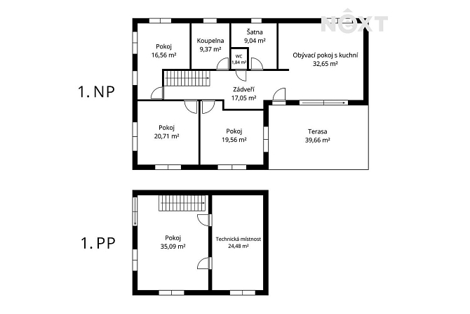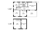 1. nadzemní podlaží: otevřený obývací prostor s kuchyní, tři samostatné ložnice/pokoje, koupelna, šatna, zádveří, vstup na prostornou terasu navazující na zahradu