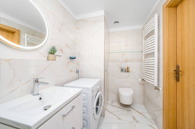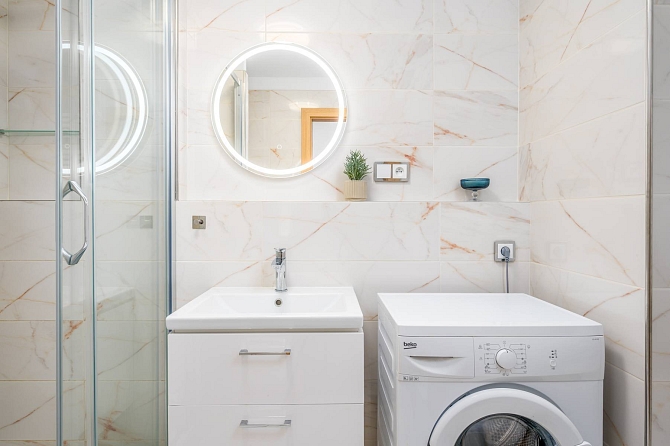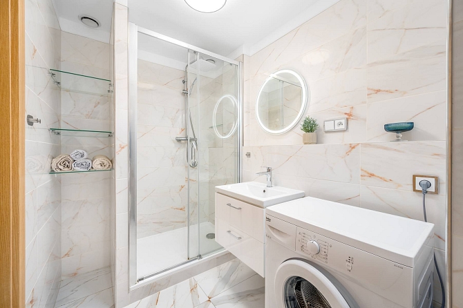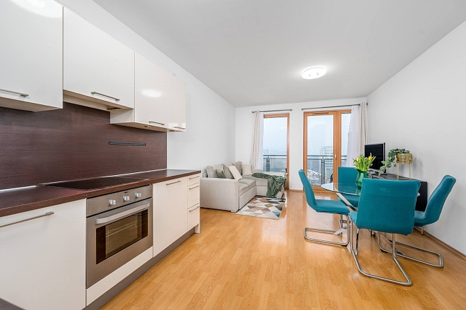 Kuchyň je plně vybavena: lednice, trouba, mikrovlnná trouba, myčka a varná deska. Z pokoje je přístup na zastřešený balkon.