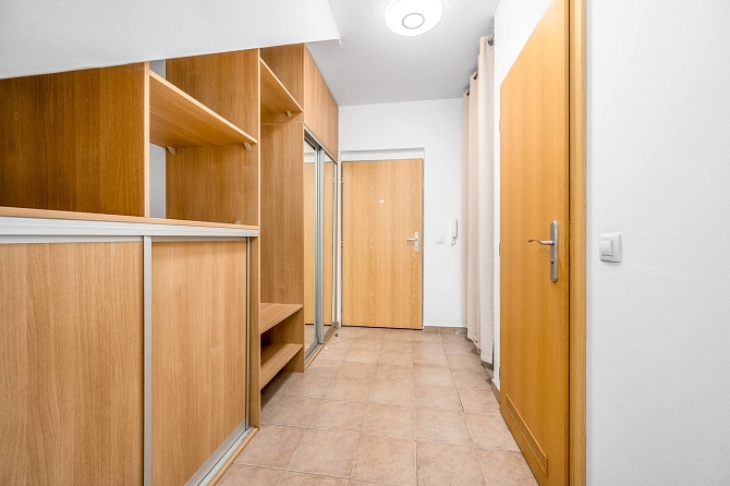 Vstupní předsíň nabízí vestavěnou skříň a kout s úložným prostorem. Také je zde vstup na samostatnou toaletu. Z předsíně se dále dostanete do prostorného obývacího pokoje, který je propojen s kuchyňským a jídelním koutem.