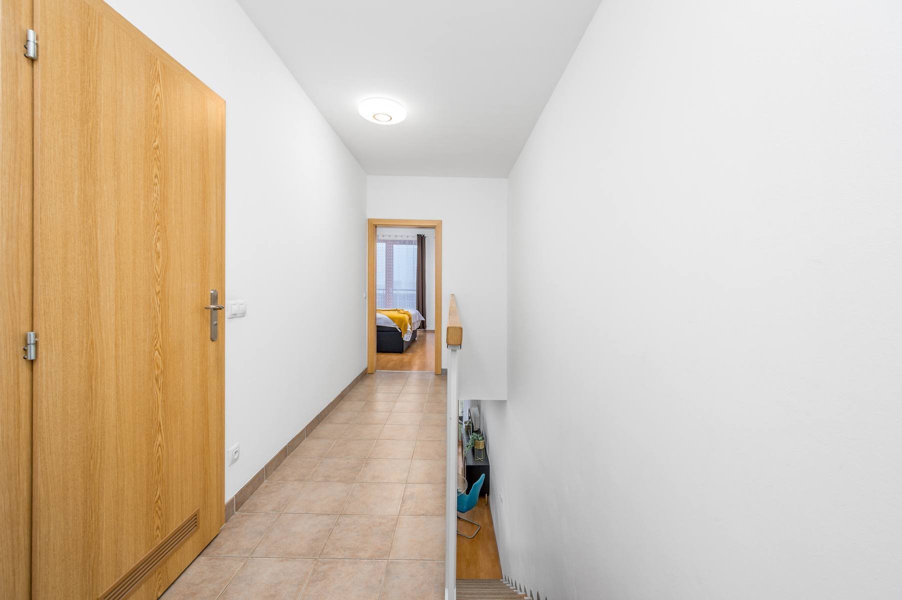 Po schodišti se vchází do horního patra, kde se nachází prostorná chodba, odkud se dostanete do ložnice se šatní skříní, pracovním koutem a vstupem na druhý balkon. Na tomto podlaží je také koupelna se sprchovým koutem a toaletou.